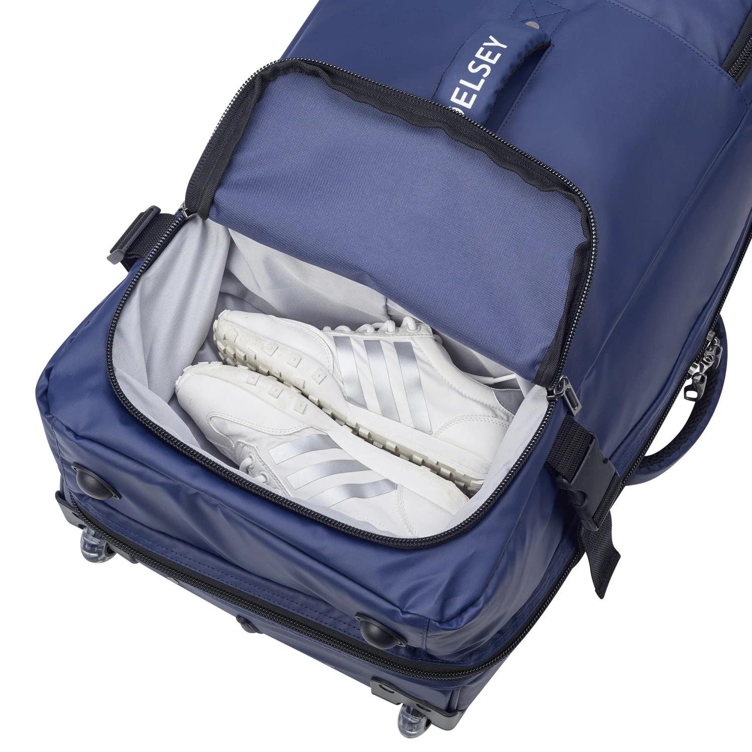 Diese Reisetasche lässt sich in der Mitte öffnen und ist in zwei gleich große Reißverschlussfächer unterteilt. An der Innenseite angebrachte Gurte halten Ihre Sachen an ihrem Platz. Die Tasche verfügt außerdem über ein Schuhfach, das direkt von außen zugänglich ist – ideal, um zu verhindern, dass Ihre Sachen nach einer Wanderung schmutzig werden!