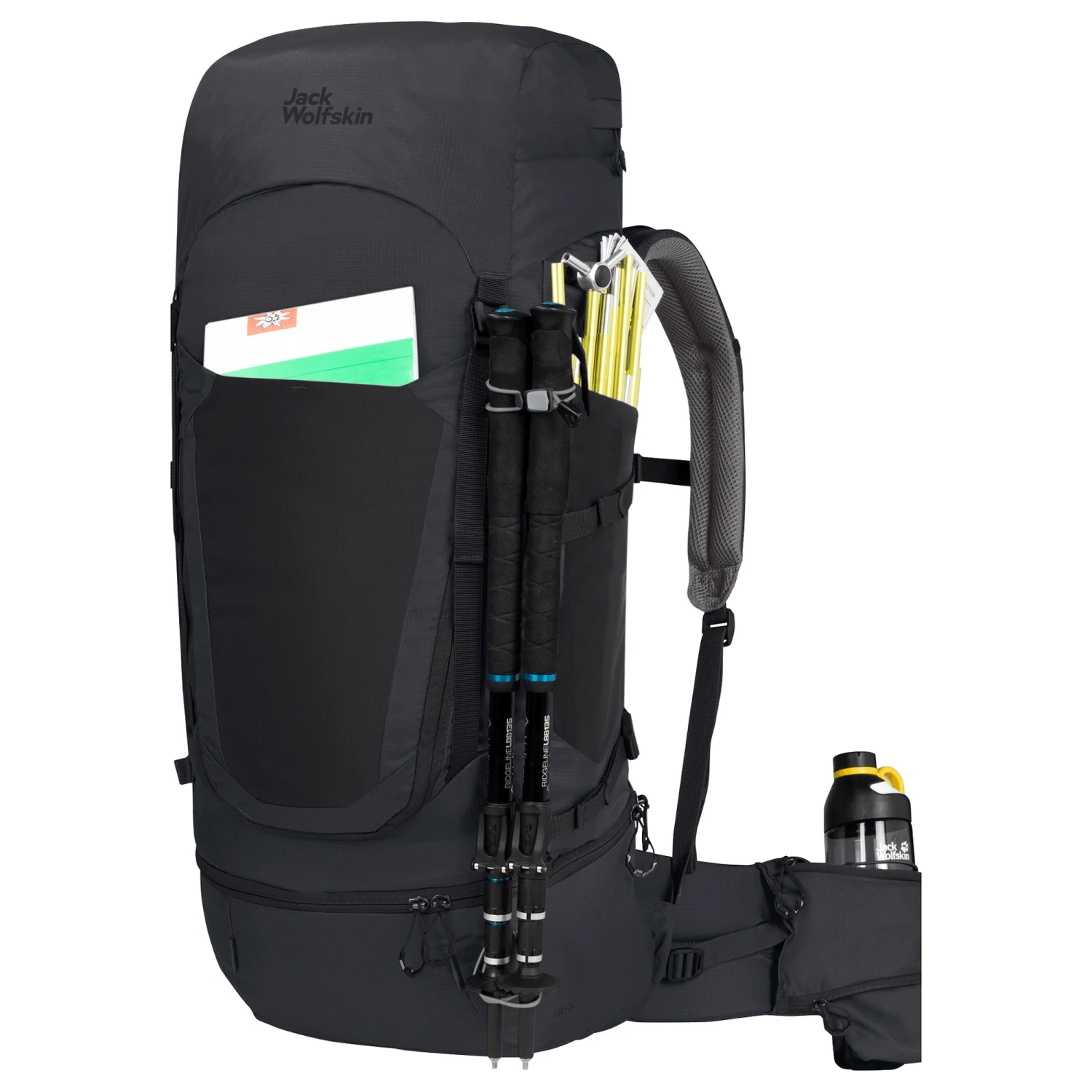 Der Trekkingrucksack HIGHLAND TRAIL 55+5 für Männer von Jack Wolfskin ist mit einem höhenverstellbaren Tragesystem ausgestattet und besteht aus wiederverwerteten Materialien. Das Tragesystem ist komfortabel und hat eine gute Belüftung des Rückens. Das Deckelfach lässt sich dank extralangem Reißverschluss weit öffnen. Deine Trinkflasche platzierst du am Hüftgurt oder nutzt ein Trinksystem. Das Hauptfach erreichst man von oben oder über den Frontreißverschluss.