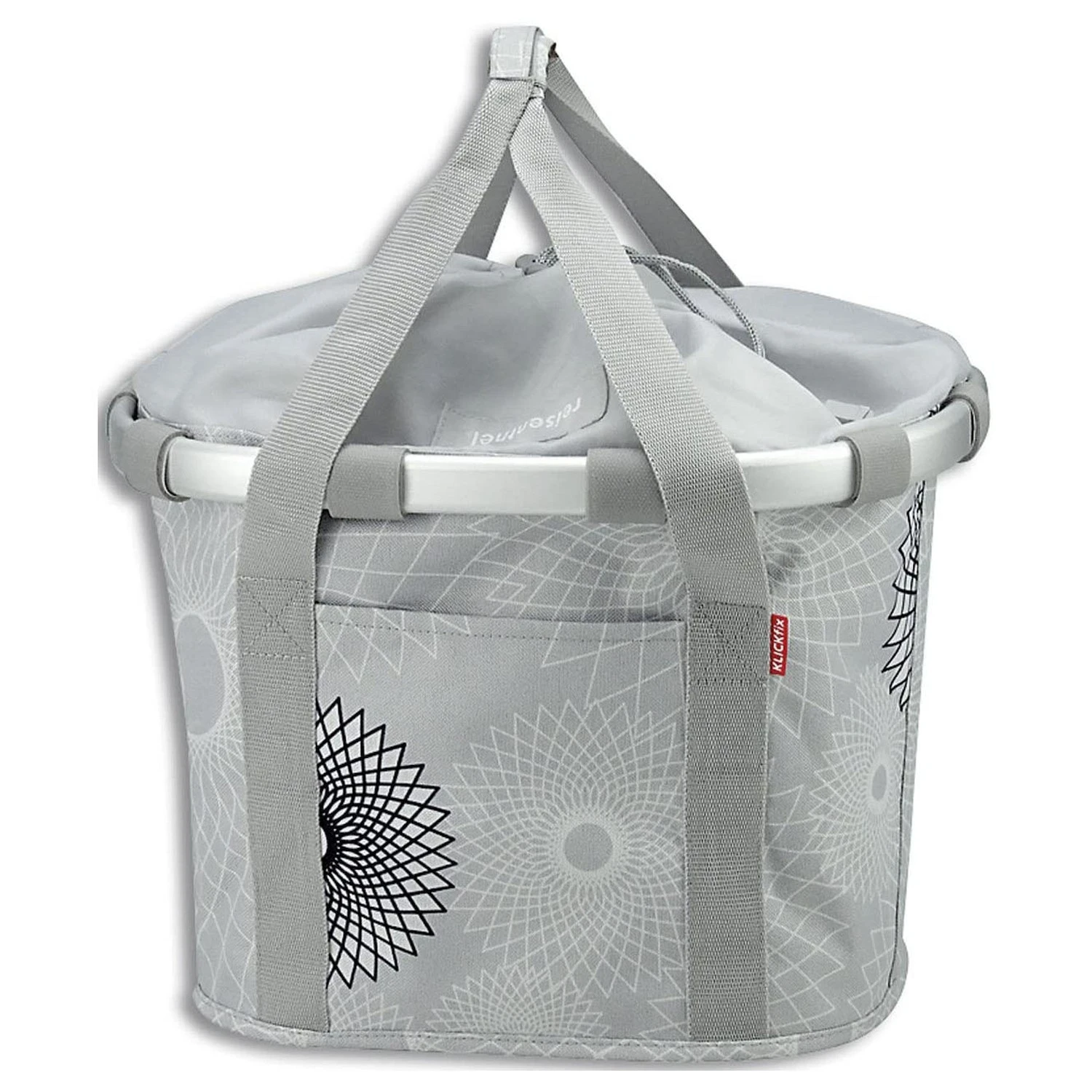 Ergebnis der Kooperation zweier starker Marken. Der schicke Textilkorb von Reisenthel mit dem markanten leichten Aluminiumrahmen – ausgerüstet mit Kupplung für den KLICKfix Lenkeradapter von RIXEN & KAUL. Zum Shoppen oder Ausflug findet hier jeder ein passendes Dekor zum Rad. Mit dem Kordelzug wird der Korb ruckzuck geschlossen. Handy Schlüssel & Co finden Ihren Platz in den praktischen Extrafächern und wenn der Korb mal länger verstaut wird, lässt er sich flach zusammenlegen.