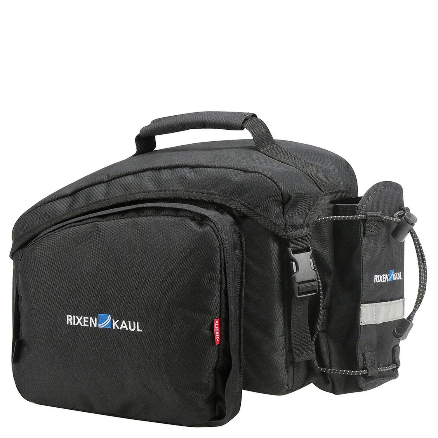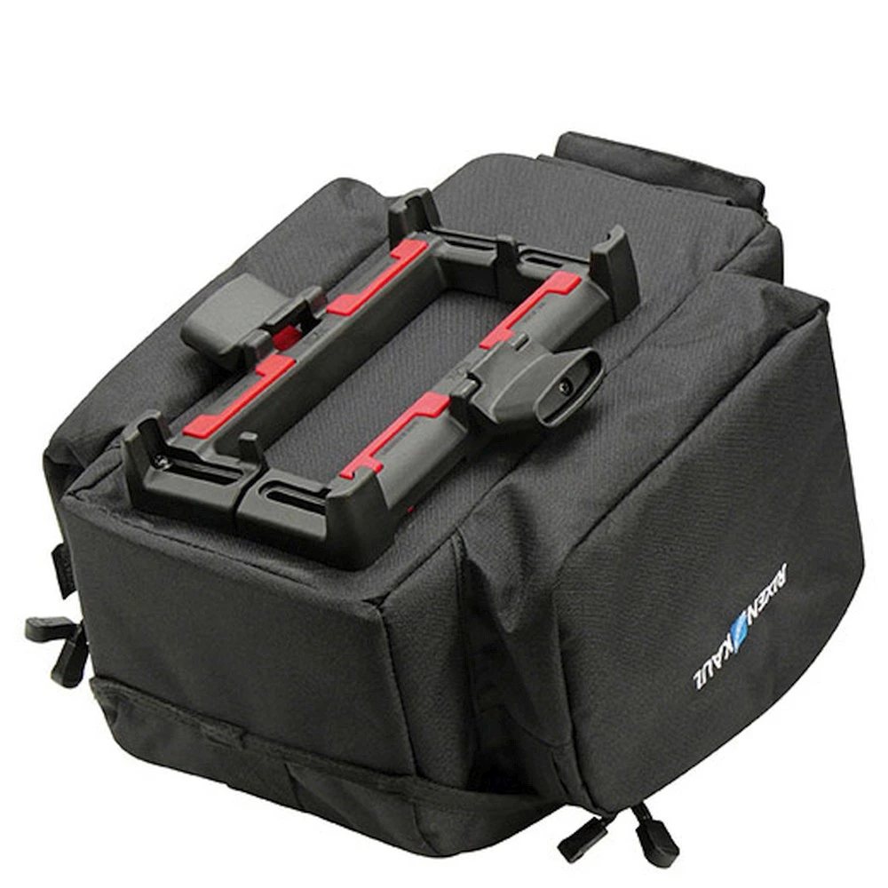 Formstabile Tasche mit gepolsterten Seitenwänden und ausklappbaren Seitentaschen, einseitig mit Netzfach. Das Haupfach mit Doppel-RV wird von einer zusätzlichen Stoffklappe abgedeckt, unter der auch Jacke oder Pulli verstaut werden können. Das Flaschenfach an der Rückseite lässt sich mit Zurgurt flach anlegen. Mit Reflektor, Lampenhalter, Tragegriff und Regenhaube. (Hinweis: Ausgeklappte Seitentaschen werden von der Regenhaube nicht komplett abgedeckt und sind nur an Gepäckträgern mit seitlicher Abstützung verwendbar.)