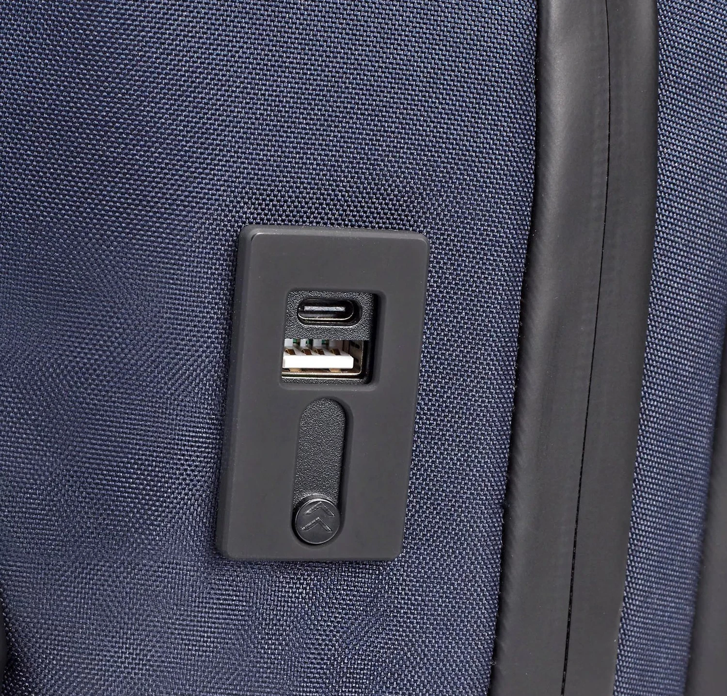 - Laptopfach mit Gurtband verschlossen und abschließendes Gummiteil mit Logo