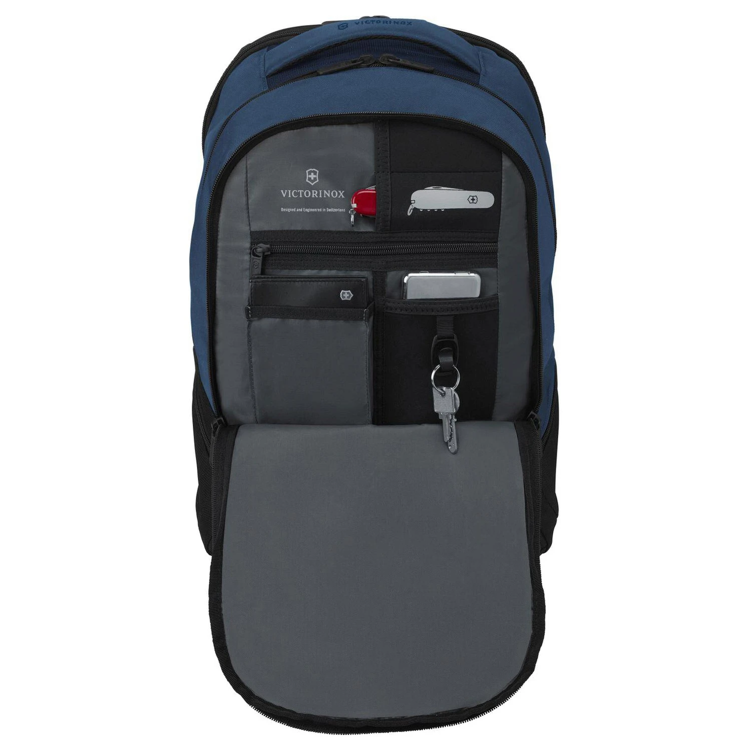 - Frontfach mit Reißverschlussfach, Schlüsselhalterung, Einsteckfach und Handyfach